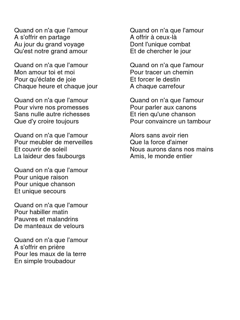 Quand on n'a que l'amour pour vivre nos promesses sans nulle autre richesse que d'y croire toujours. Comment must not exceed 1000 characters. Quand on n'a que l'amour à s'offrir en partage au jour du grand voyage qu'est notre grand amour.